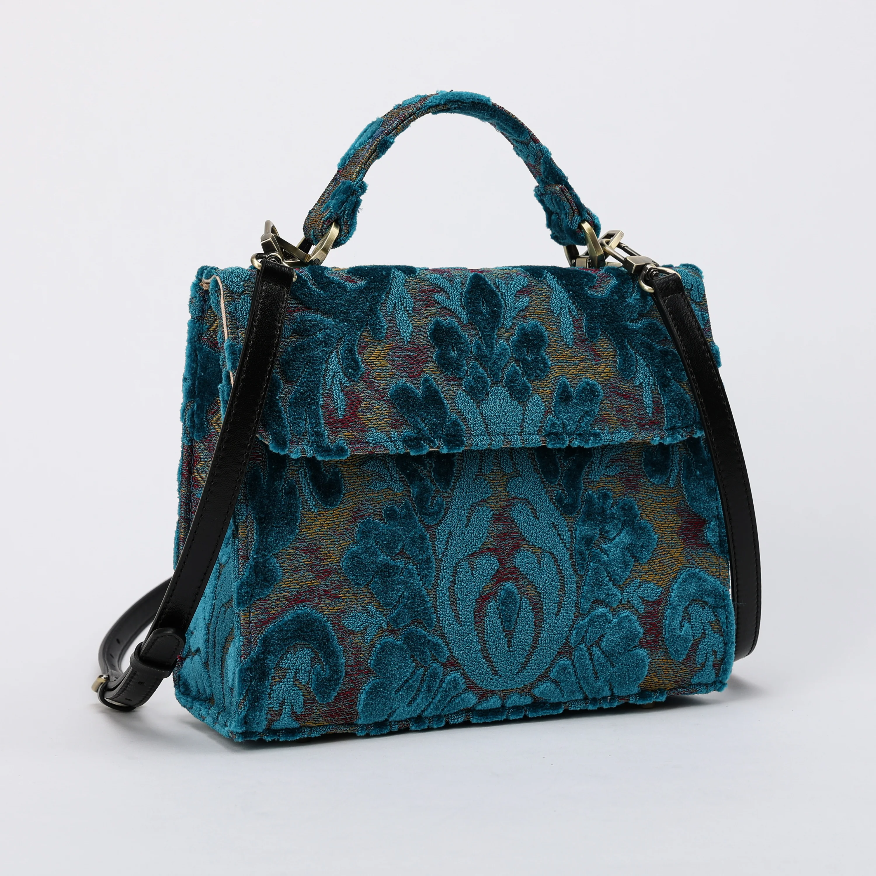 This exquisite satchel is the perfect companion for your daily adventures, whether it’s a workday or a weekend getaway, it has you covered. it's a perfect blend of style and practicality. Spacious interior with zipper and slip pockets, detachable shoulder strap. Sturdy exterior in carpet or velvet, cotton lining. Convenient magnetic flap closure, brass feet for stability.