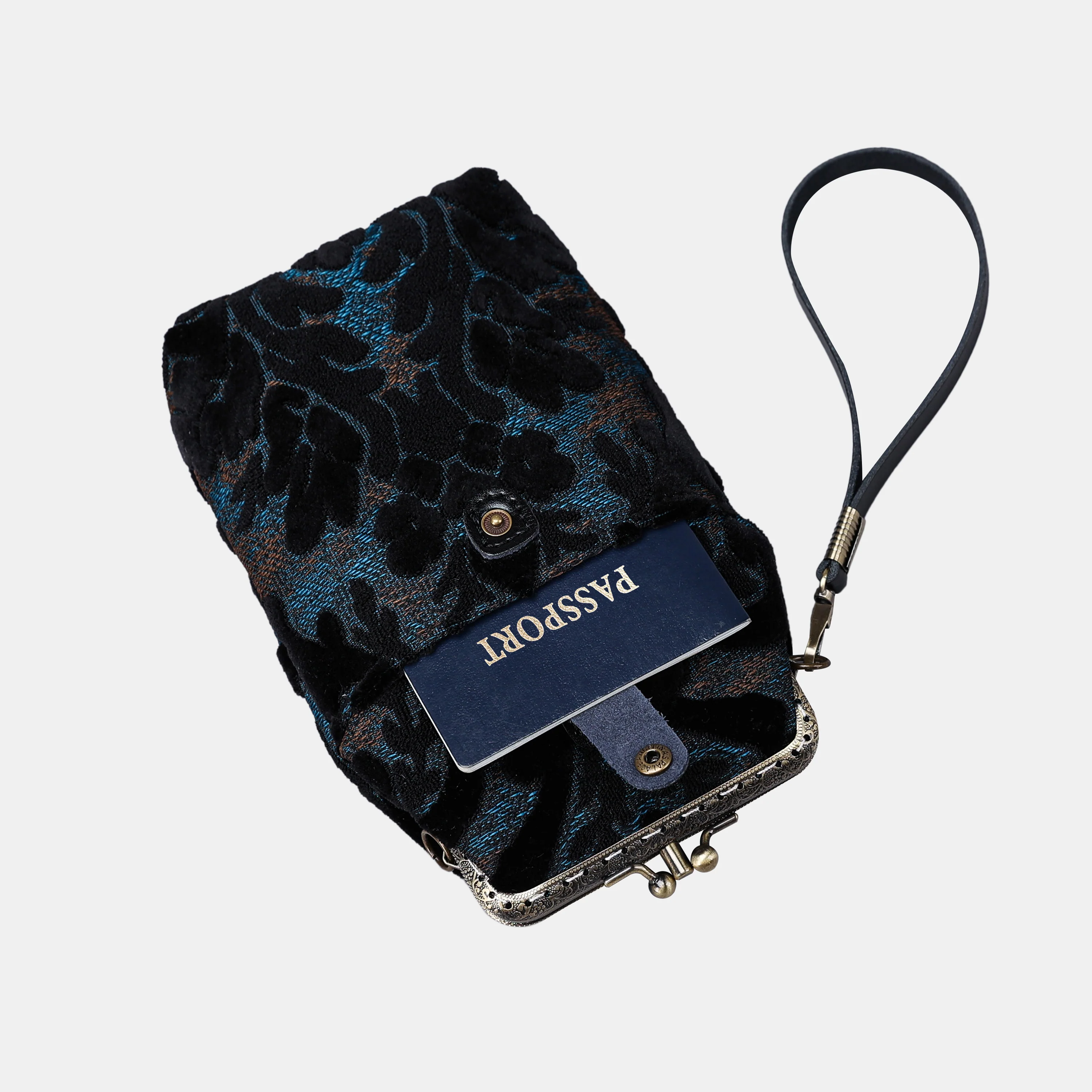 The main body of the functional phone case is made with burnout velvet, cotton floral canvas, and brass clasp with double kiss lock. With the width 4.15" and height 8.60" it can easily hold phones of any sizes (max phone width to 4"), with the leather wrist strap that comes with the bag. There are two mini rings at both sides of the clasp and it will come with a 120cm detachable chain with hooks so this bag could be switched to crossbody.