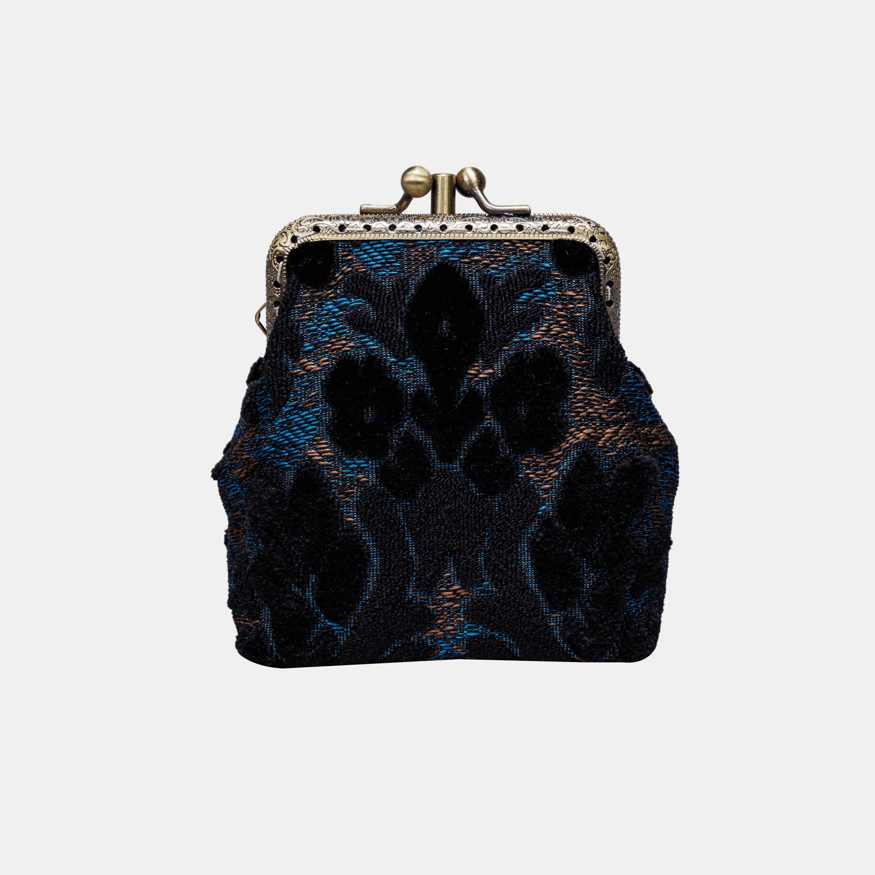 The main body of coin purse is made with burnout velvet, cotton floral canvas, and brass clasp with double kiss lock.