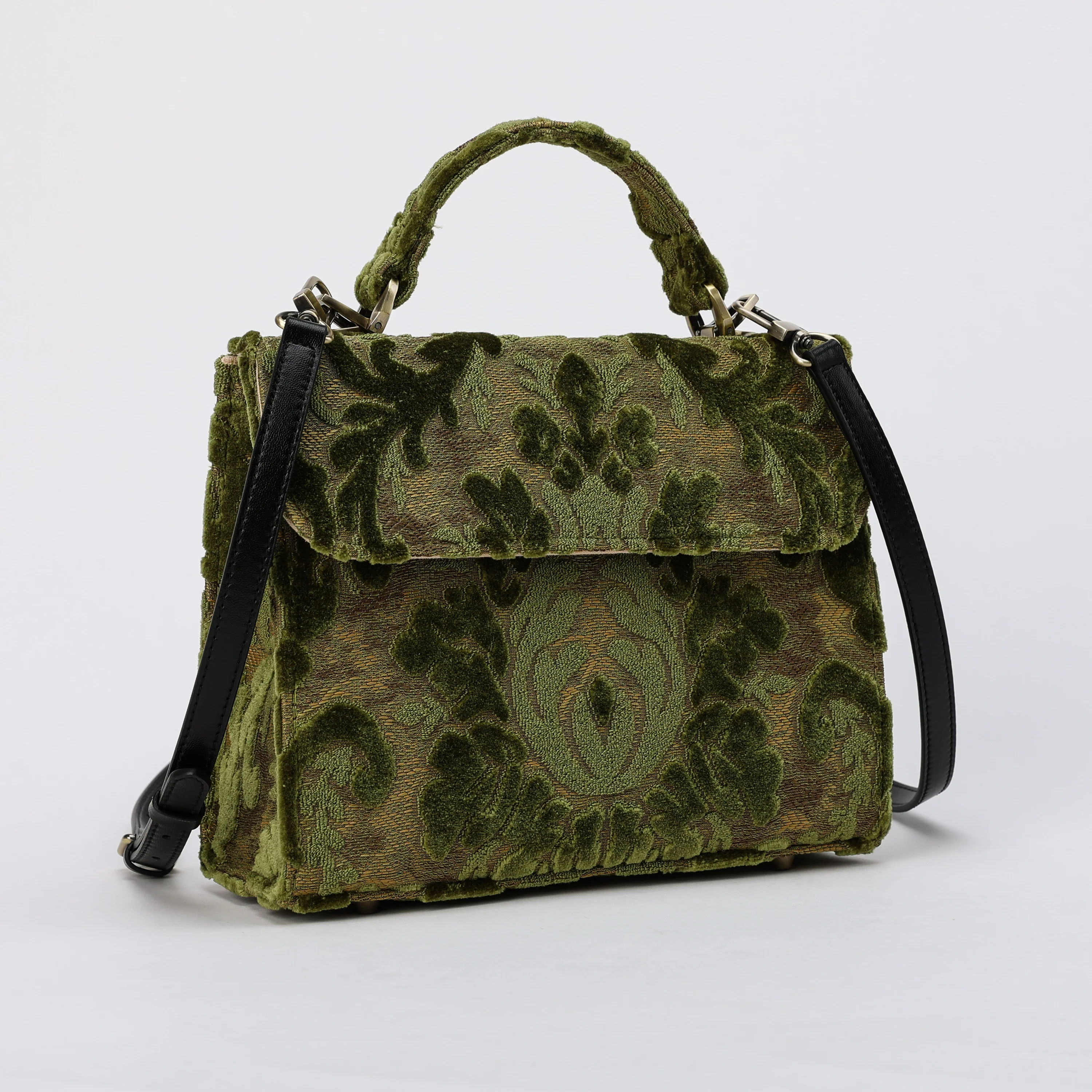 This exquisite satchel is the perfect companion for your daily adventures, whether it’s a workday or a weekend getaway, it has you covered. it's a perfect blend of style and practicality. Spacious interior with zipper and slip pockets, detachable shoulder strap. Sturdy exterior in carpet or velvet, cotton lining. Convenient magnetic flap closure, brass feet for stability.