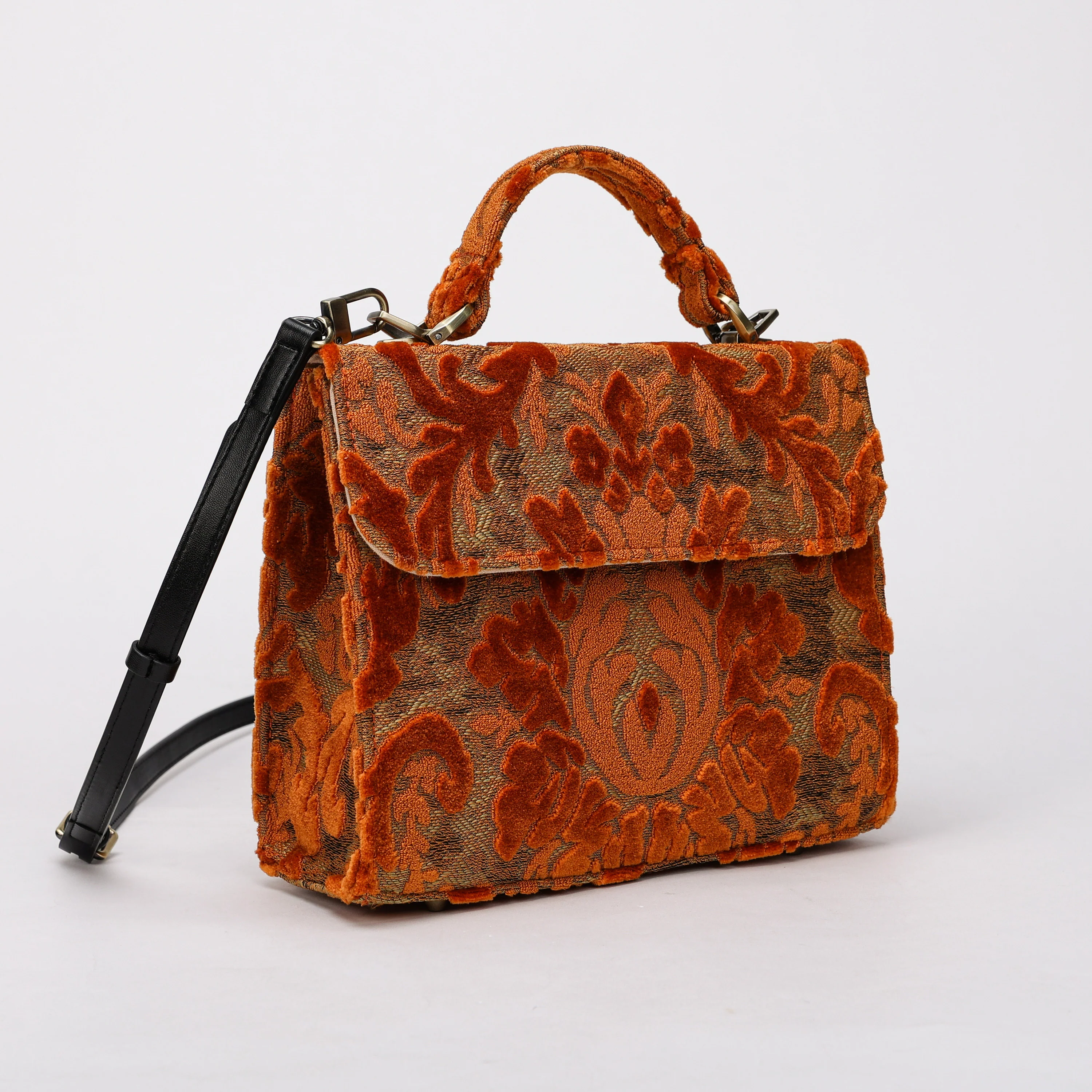 This exquisite satchel is the perfect companion for your daily adventures, whether it’s a workday or a weekend getaway, it has you covered. it's a perfect blend of style and practicality. Spacious interior with zipper and slip pockets, detachable shoulder strap. Sturdy exterior in carpet or velvet, cotton lining. Convenient magnetic flap closure, brass feet for stability.