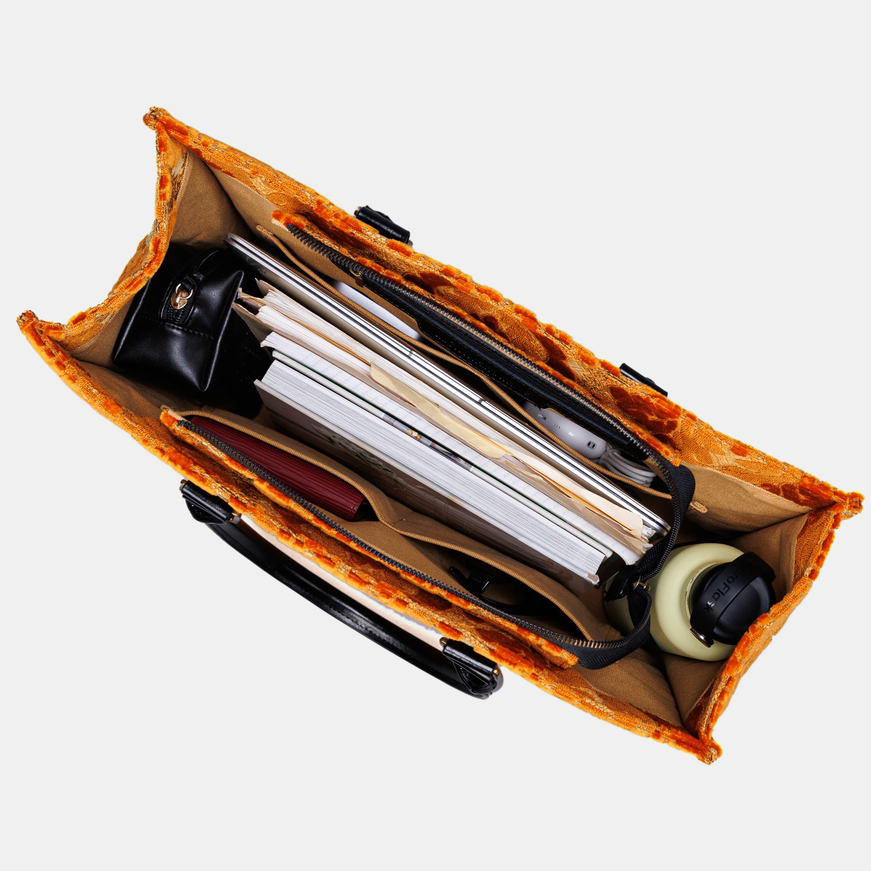 Designed to adapt to your daily needs, this tote bag comfortably accommodates large-size laptops such as the MacBook Pro 16" and ThinkPad X1 Extreme. We have optimized the main compartment by making the interior organizer pockets flat instead of pleated, providing more space for your essentials. Additionally, a wide elastic band on one side securely holds a water bottle, accommodating sizes up to 64oz, including popular brands like Hydro Flask.