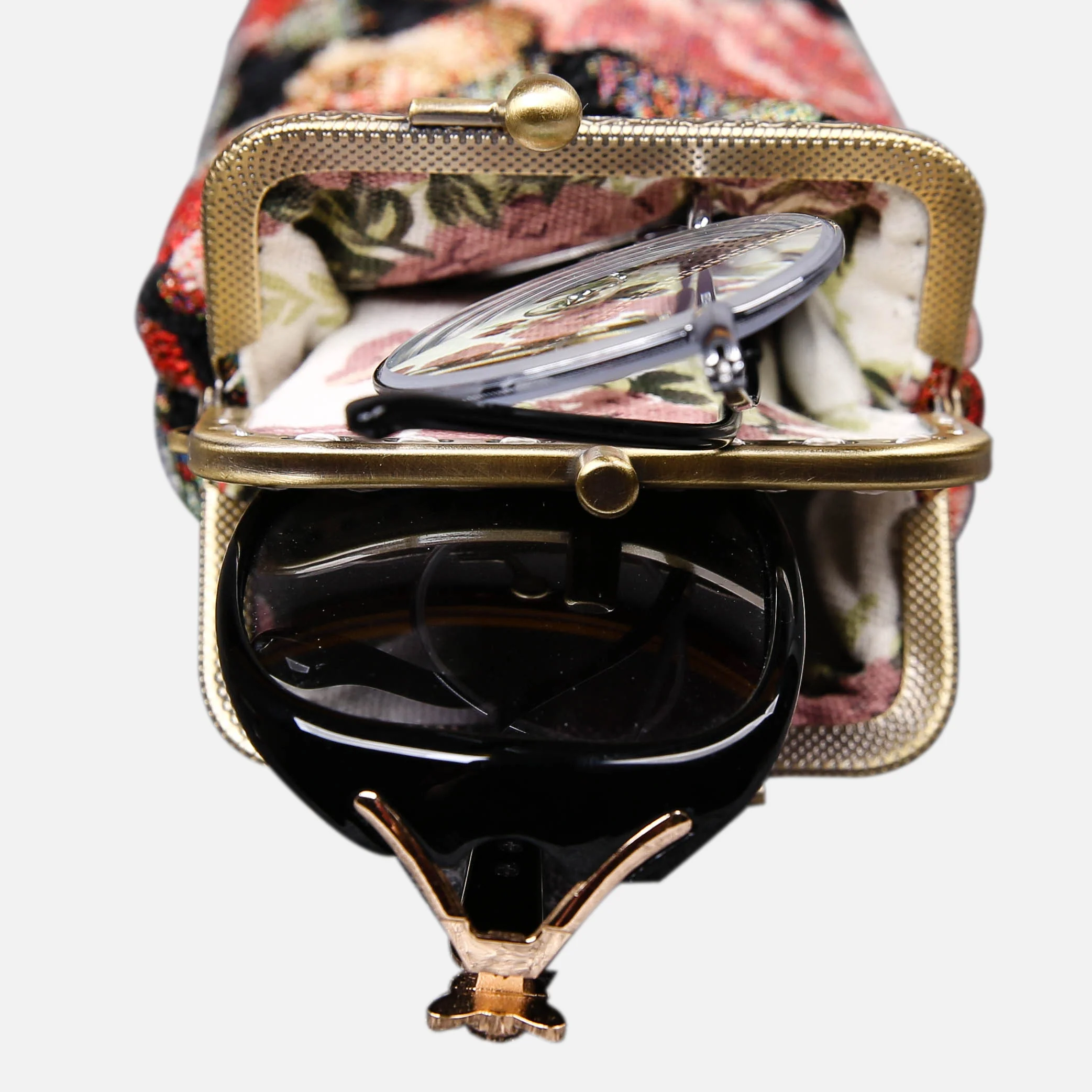 The main body of glasses case is made with rich chenille carpet, cotton floral canvas, and brass clasp with double kiss lock, with the enhanced sewing pattern each compartment is roomy enough for reading glasses and sunglasses as well.