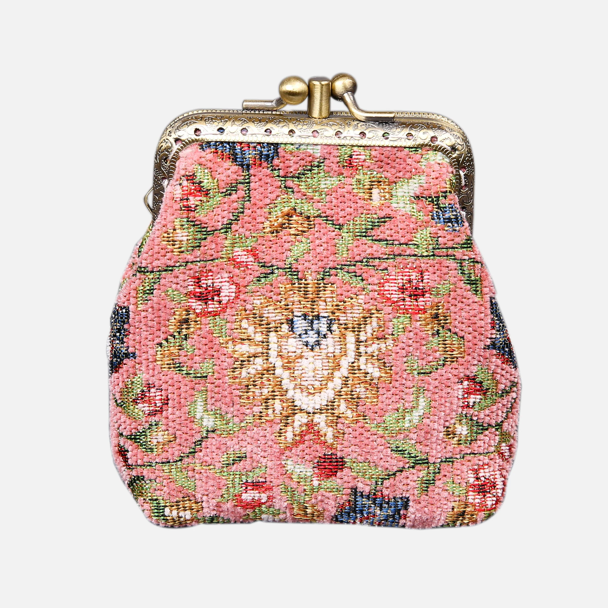 The main body of coin purse is made with rich chenille carpet, cotton floral canvas, and brass clasp with double kiss lock.