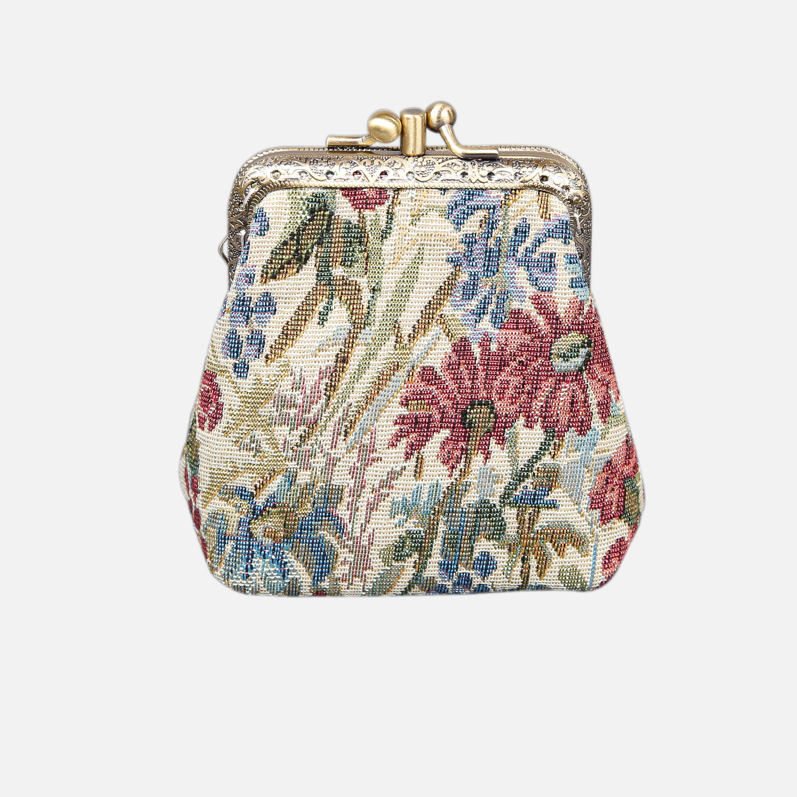 The main body of coin purse is made with rich chenille carpet, cotton floral canvas, and brass clasp with double kiss lock.